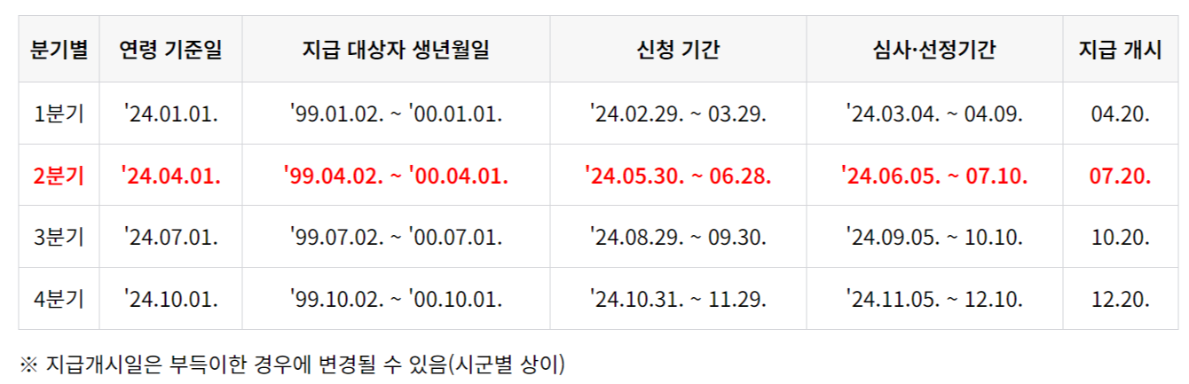 - 2분기에 신청하게되면 심사와 선정기간을 거쳐 7월 20일부터 지급이 시작됩니다.